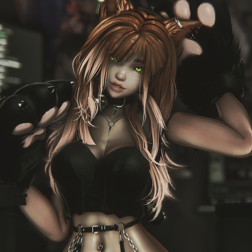 Accessories : Star Earrings : Skulli, Arm Warmers : Miru, Belly Ring : BeanieBaby, Necklace : BeanieBaby, Blade Plushie : bunnieverse, Collar : JinxieWinks, Mouth Dumpling : ifonlyurs, Leg Harness : Koragira, Stiletto Nails and Rings : Virtual Spice, Kitty and Puppy Tail and Ears : JinxieWinks, Paws : Zoxl